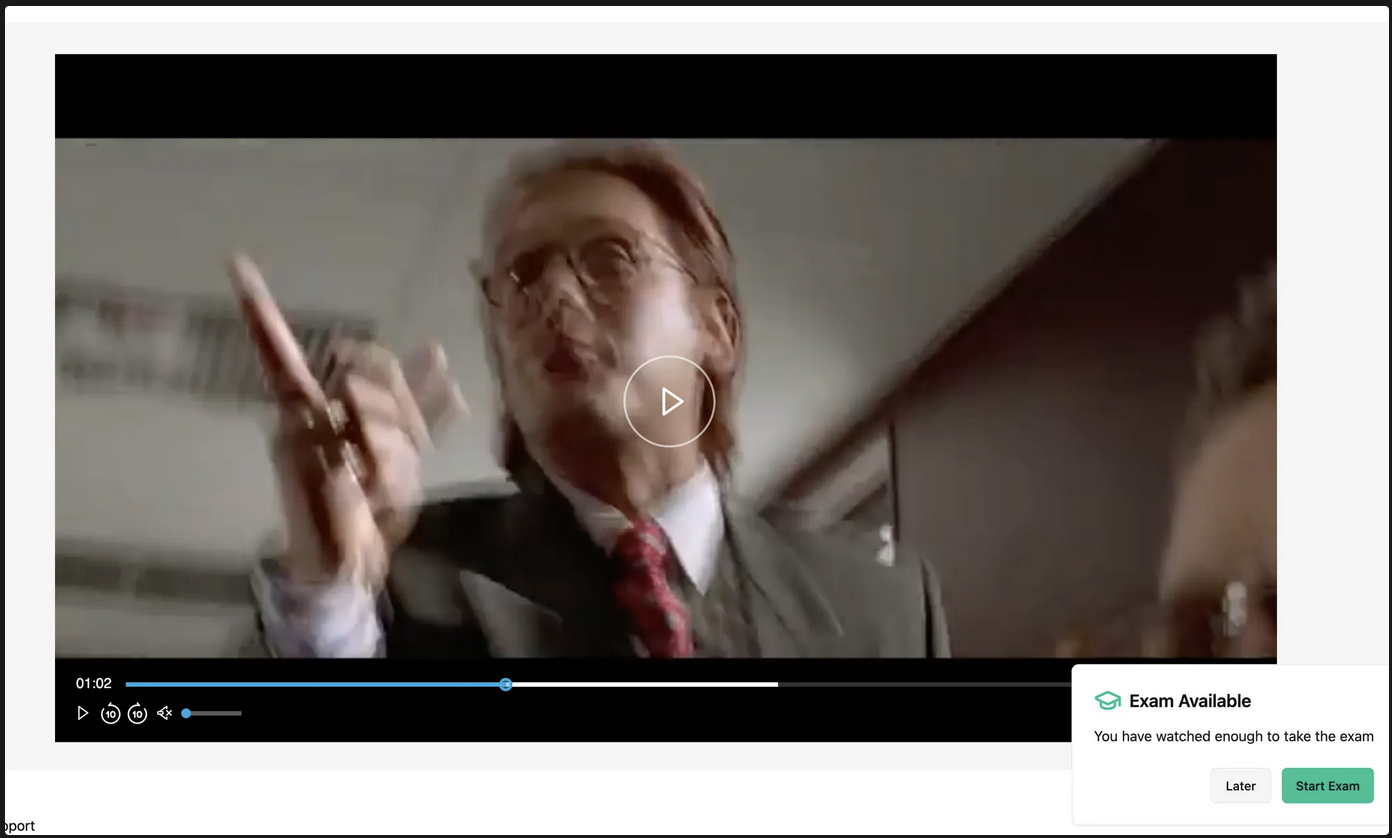 You can configure when an exam becomes available to participants. For example, an exam can be set to appear after a participant has watched a specific duration of your video-on-demand (VOD) content (e.g., “after watching 1 minute of VOD”).